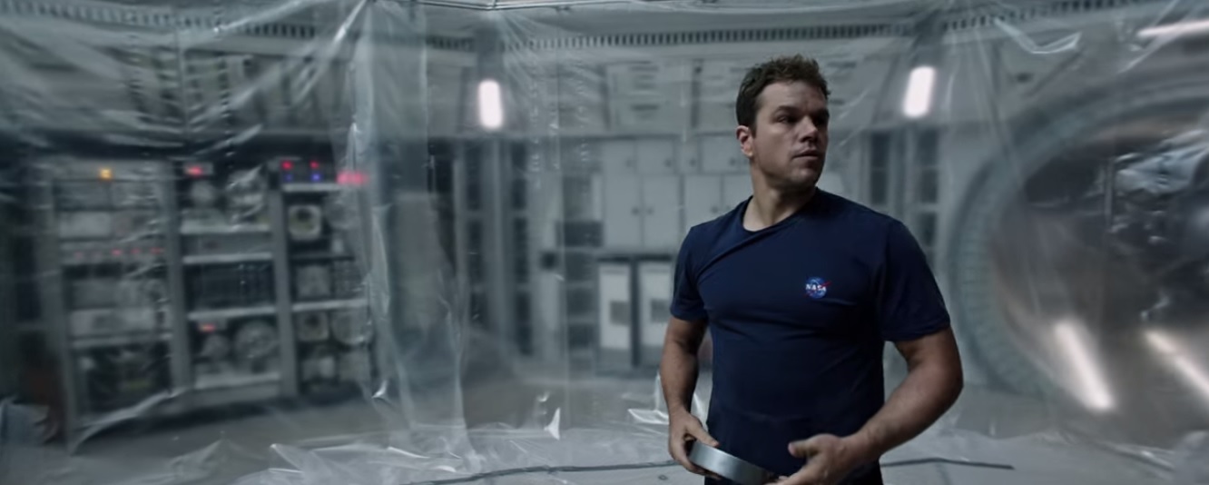 | Mark Watney (Matt Damon) adecúa un espacio dentro del hábitat para cultivar papas y así alargar su estadía mientras es rescatado. |
